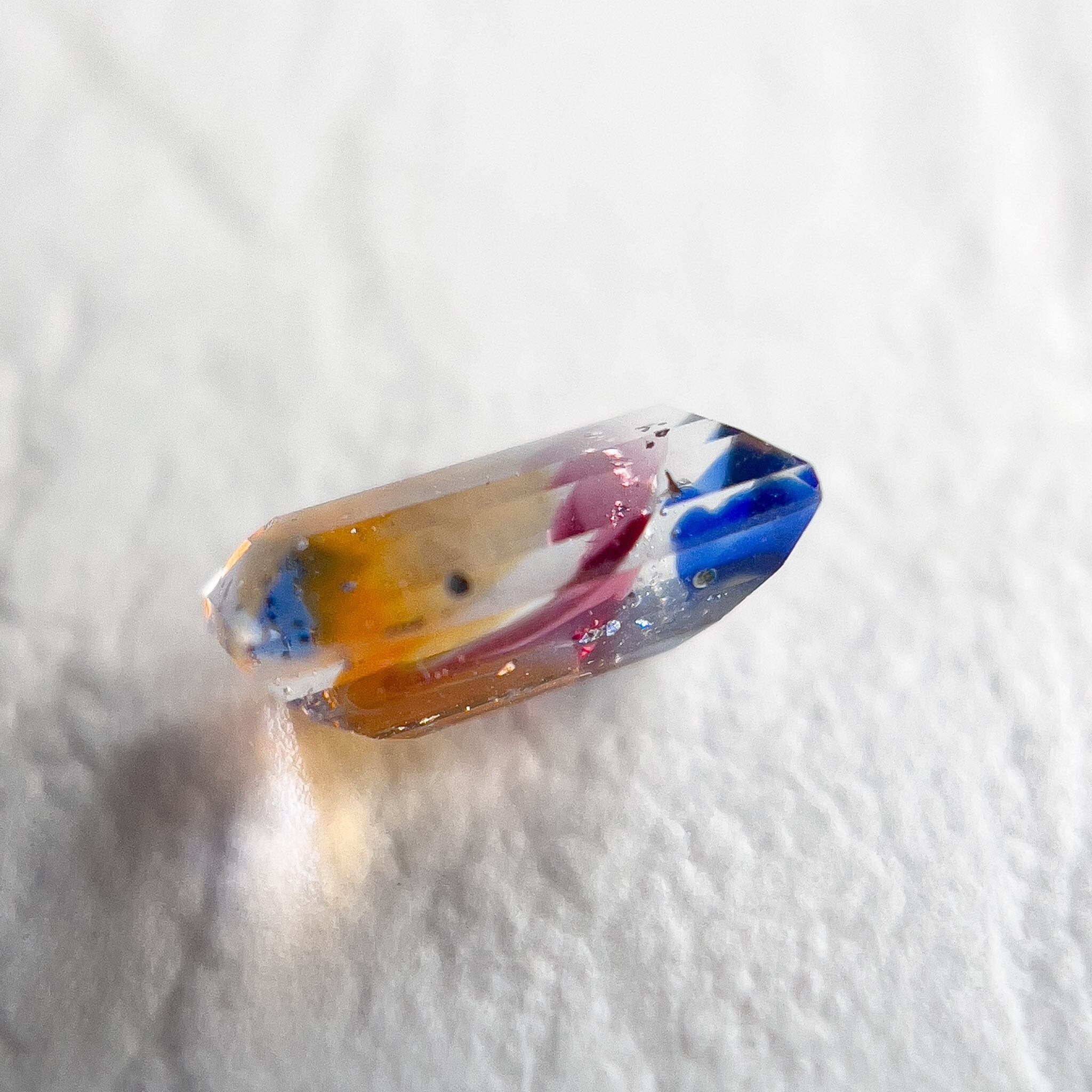 yuia glass の「硝子の宝石」は、色ガラス棒を1本ずつ手作業で溶かして制作した“ガラスの原石”を、宝石研磨職人が丁寧に研磨して仕上げた特別な作品です。