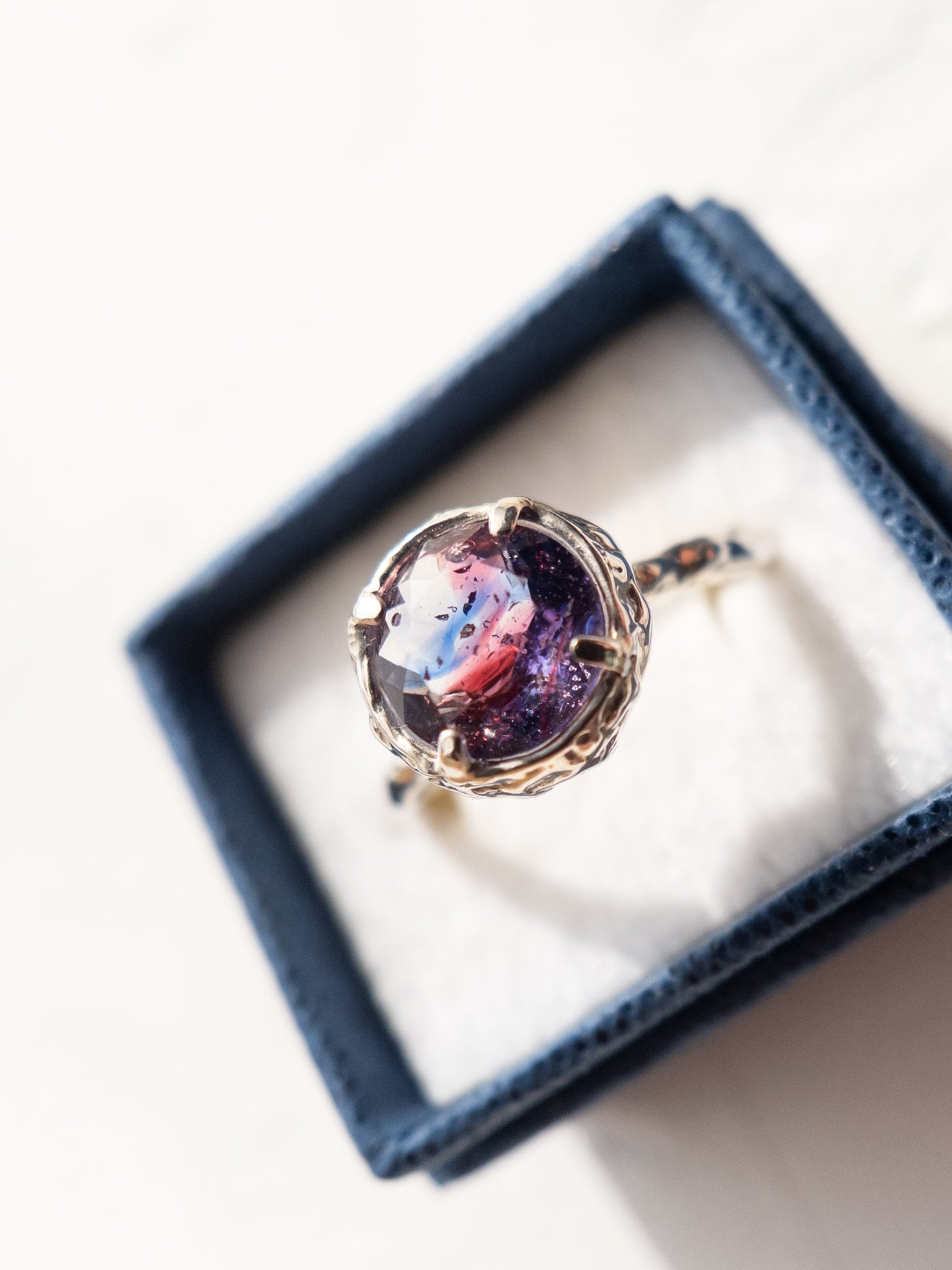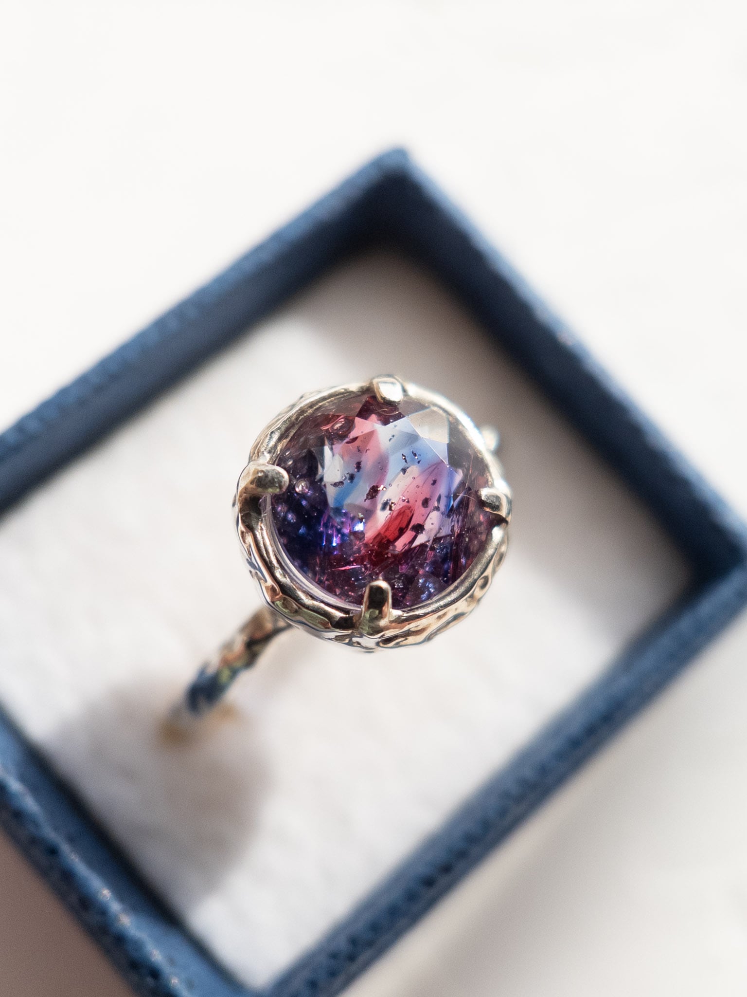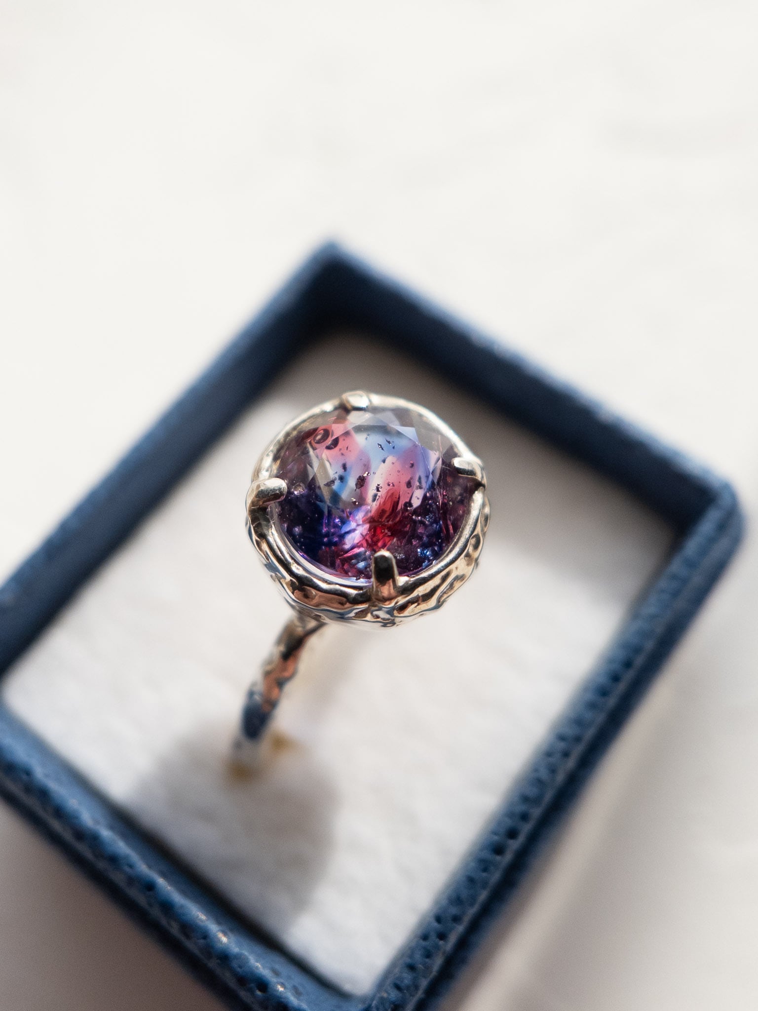 光の当たり方によって、ブルーの透明感と金赤の深みが重なり合い、