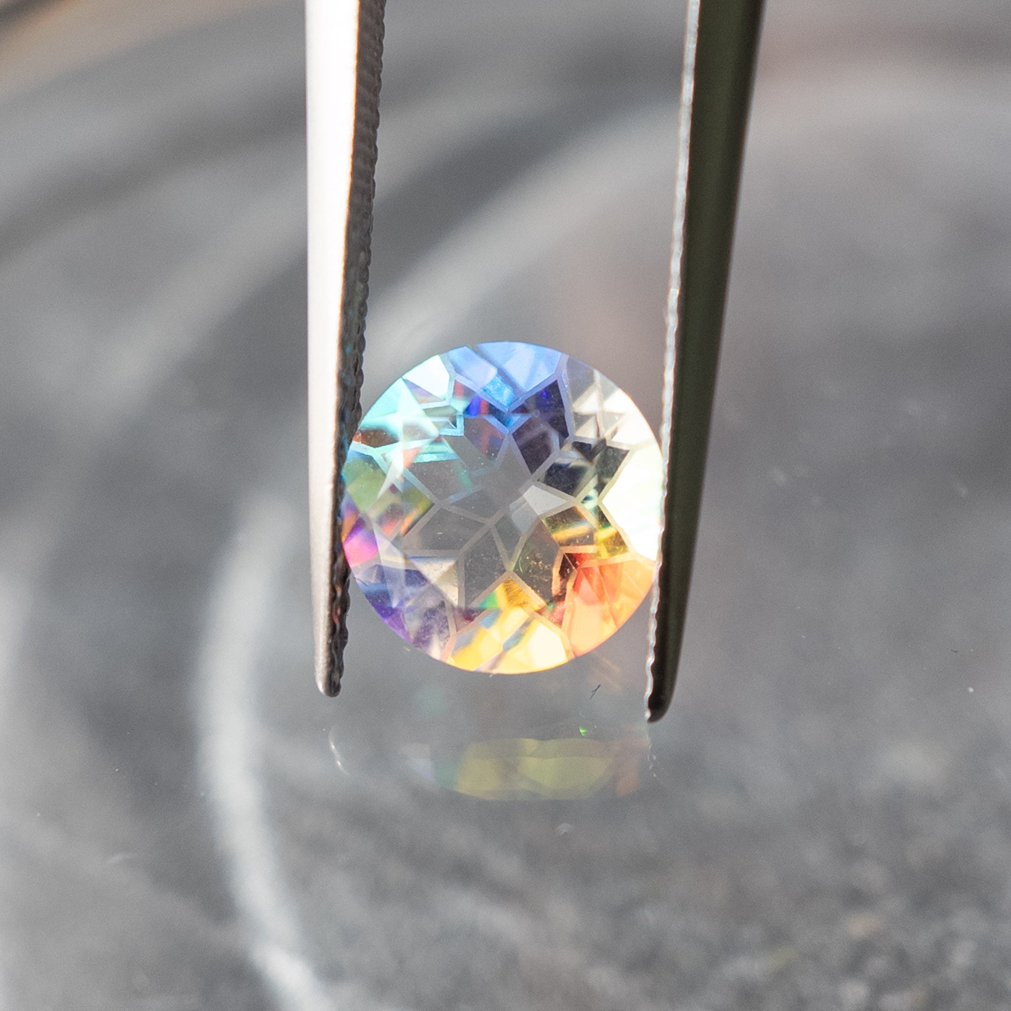 幾重にも重なるカット面が、赤・青・緑・紫といった光を反射し、