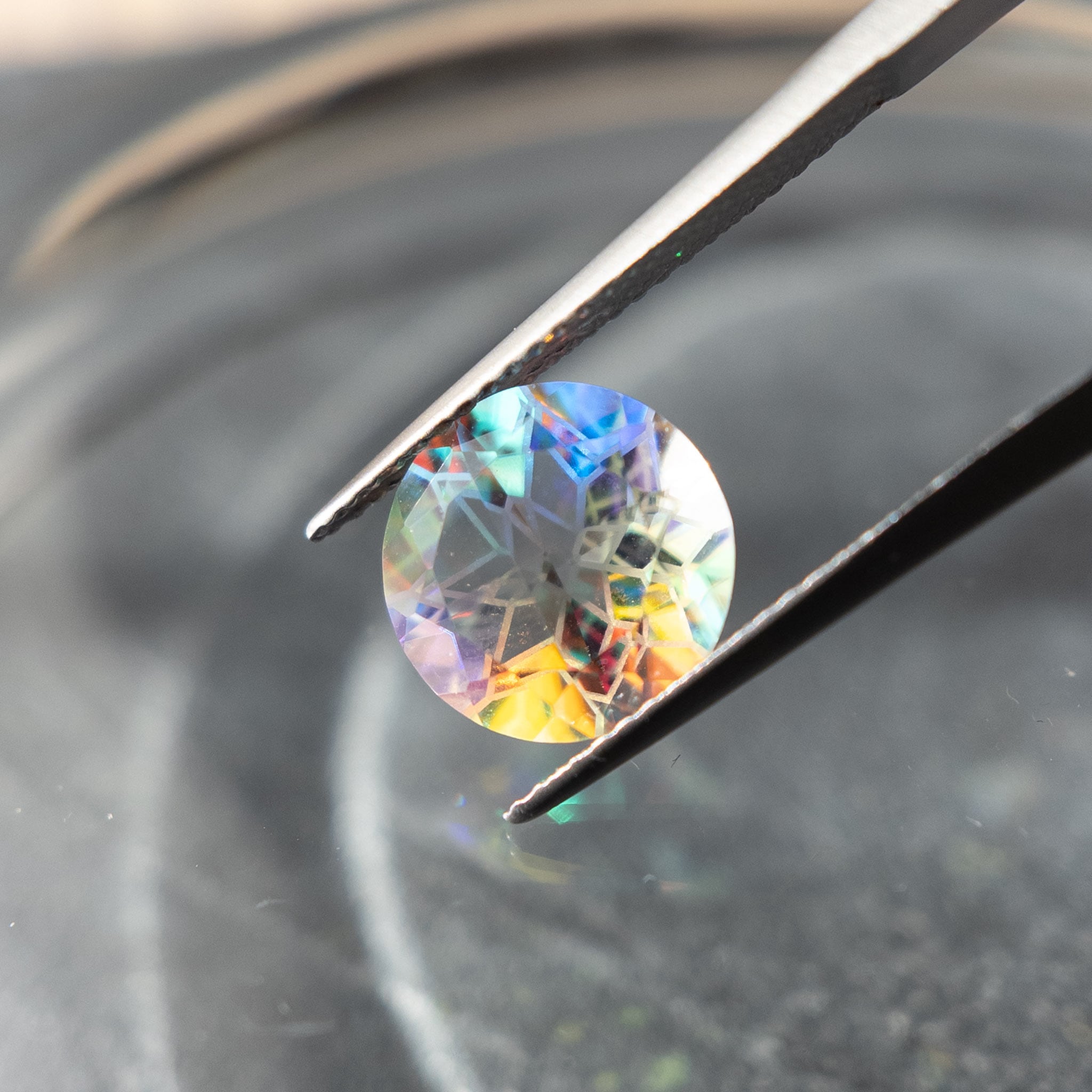 幾重にも重なるカット面が、赤・青・緑・紫といった光を反射し、